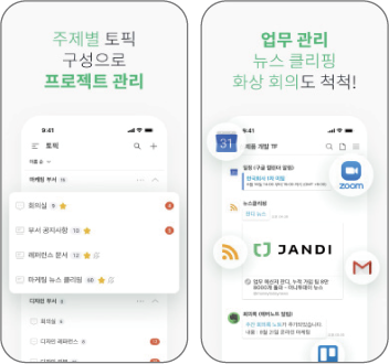 메모형 블로그 UI를 가진 노션은 간결한 서비스를 제공하는 협업툴로 최근 큰 인기를 끌고 있습니다. 실시간으로 여러 명의 작업자가 한 문서를 함께 작성할 수 있는 노션은 한국어 버전 서비스 전부터 국내에서 사용됐습니다. 맥도날드나 나이키 등의 글로벌 기업에서도 이용 중인 노션은 쉽고 간결한 UI로 뉴스레터를 발급하기도 하고, 웹페이지형 구축이 가능해 개인 웹사이트를 만드는 사람들의 포트폴리오용으로도 자주 사용되죠. SNS와 동일하게 멘션 호출을 하거나 댓글 창을 통해 의견을 나누며 편하게 업무 처리를 하는 데 도움을 줍니다.