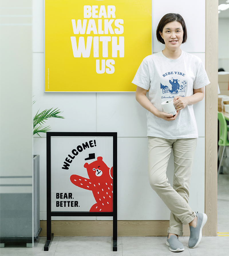 성수동에 자리한 베어베터 본사에는 ‘Bear makers the world better’라는 이름의 의미처럼 캐릭터 ‘베베’가 곳곳에 자리했습니다. 언뜻 무뚝뚝하고 고집스러우며 표정도 별로 없는 것처럼 보이는 곰이지만, 순수하고 우직한 발달장애인들의 특징을 곰에 담았습니다. 손과 눈이 빠르지는 않지만 익숙한 일은 성실하게 해내는 발달장애인들처럼 말이죠. 이진희 공동대표는 “발달장애인 사원 240여 명을 비롯해 그들의 가족까지 약 1,000명에게 안도감을 주는 회사를 꾸리는 것이 보람된 일”이라고 말합니다.