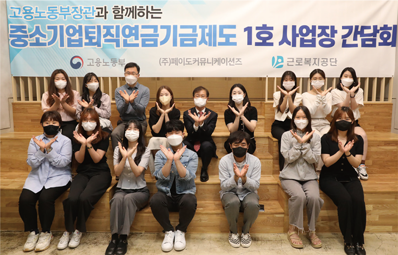 고용노동부 이정식 장관은 지난 9월 7일 중소기업퇴직연금기금제도 1호 가입 기업인 ㈜페이도커뮤니케이션즈 직원들과 만나 현장의 목소리를 듣는 자리를 마련하였습니다. 이 장관은 직원들과 도시락을 함께 먹으며 소통하는 시간을 가지면서 “현재 우리나라는 유례없이 빠른 속도로 고령화가 진행되고 있는데도 불구하고 중소기업의 퇴직연금제도 도입률이 낮아 근로자의 노후가 걱정되는 상황”이라며 “중소기업퇴직연금기금제도를 통해 근로자들의 퇴직급여 적립금을 잘 운용하여 든든한 노후 자금으로 되돌려 드릴 수 있도록 노력하겠다”고 밝혔습니다. 중소기업퇴직연금기금제도는 퇴직연금 도입률이 낮아 퇴직급여 수급권 보호가 미흡한 30인 이하 사업장을 대상으로 퇴직연금 가입을 촉진하고 근로자 노후 소득을 보장하기 위한 제도인데요. 30인 이하 중소기업의 사용자와 근로자가 납입한 부담금을 적립하여 공동의 기금을 조성·운용하고 그 수익을 근로자의 퇴직급여로 지급하며, 기금 조성을 위해 사용자는 근로자의 연간 임금 총액의 1/12 이상(사용자 부담금)을 매년 근로복지공단에 적립금으로 납부해야 합니다. 또한, 이와 별개로 근로자는 개별 부담금을 추가 납입할 수도 있습니다. 올해 4월 14일 제도 시행 이후 주거래은행·자산운용기관을 선정하고, 전산 구축 작업을 거쳐 9월 1일부터 본격적으로 제도를 운영하고 있습니다. 사용자와 근로자가 납입한 적립금은 근로복지공단이 전문 자산운용기관의 기술을 활용하여 안정성과 수익성을 함께 고려해 운용됩니다. |
