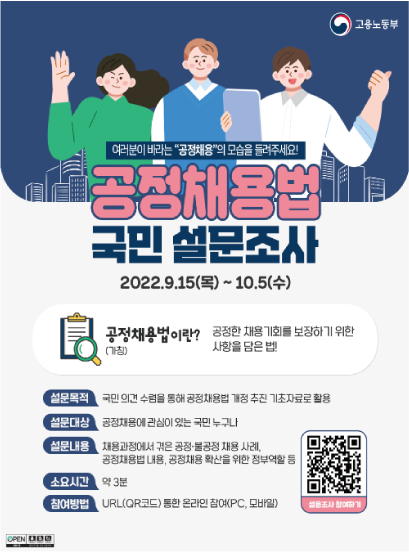 고용노동부는 공정채용에 관한 국민의 다양한 목소리를 듣기 위해 10월 5일까지 “공정채용법 온라인 국민 설문조사”를 실시합니다. ‘공정’은 정부의 네 가지 국정 운영 원칙(국익, 실용, 공정, 상식) 중 하나로, 특히 청년이 사회에 진출하는 첫 단계인 채용 과정에서의 공정성은 반드시 지켜져야 할 핵심적인 가치입니다. 이에 고용노동부는, 공정한 채용 기회가 보장될 수 있도록, 채용 ‘과정’의 공정성에 주로 초점을 두고 있는 현행 『채용절차의 공정화에 관한 법률』을 『(가칭)공정채용법』으로 개정해 채용의 실질적 공정성과 투명성을 더욱 강화해 나갈 계획입니다. 그 첫 시작이 바로 국민의 의견을 경청하는 ‘국민 설문조사’입니다. 이번 설문조사는 채용 과정에서 겪었던 공정·불공정 채용 경험, 『공정채용법』에 담기길 바라는 내용, 공정채용 확산을 위한 정부의 역할 등으로 구성되어 있으며, 국민이 직접 입법자가 되어 『공정채용법』 조문을 만들어 볼 수도 있습니다. 설문조사에서 제시된 국민의 소중한 의견은 향후 공정채용 정책을 추진해 나가는 데에 활용됩니다. 공정채용에 관심 있는 국민이라면 누구든지 고용노동부 누리집 배너 또는 인터넷 주소(https://onsurvey.kr/Open.asp?EC=N5VG0BRU)나 QR코드를 통해 컴퓨터나 모바일로 편리하게 설문조사에 참여할 수 있습니다. |
