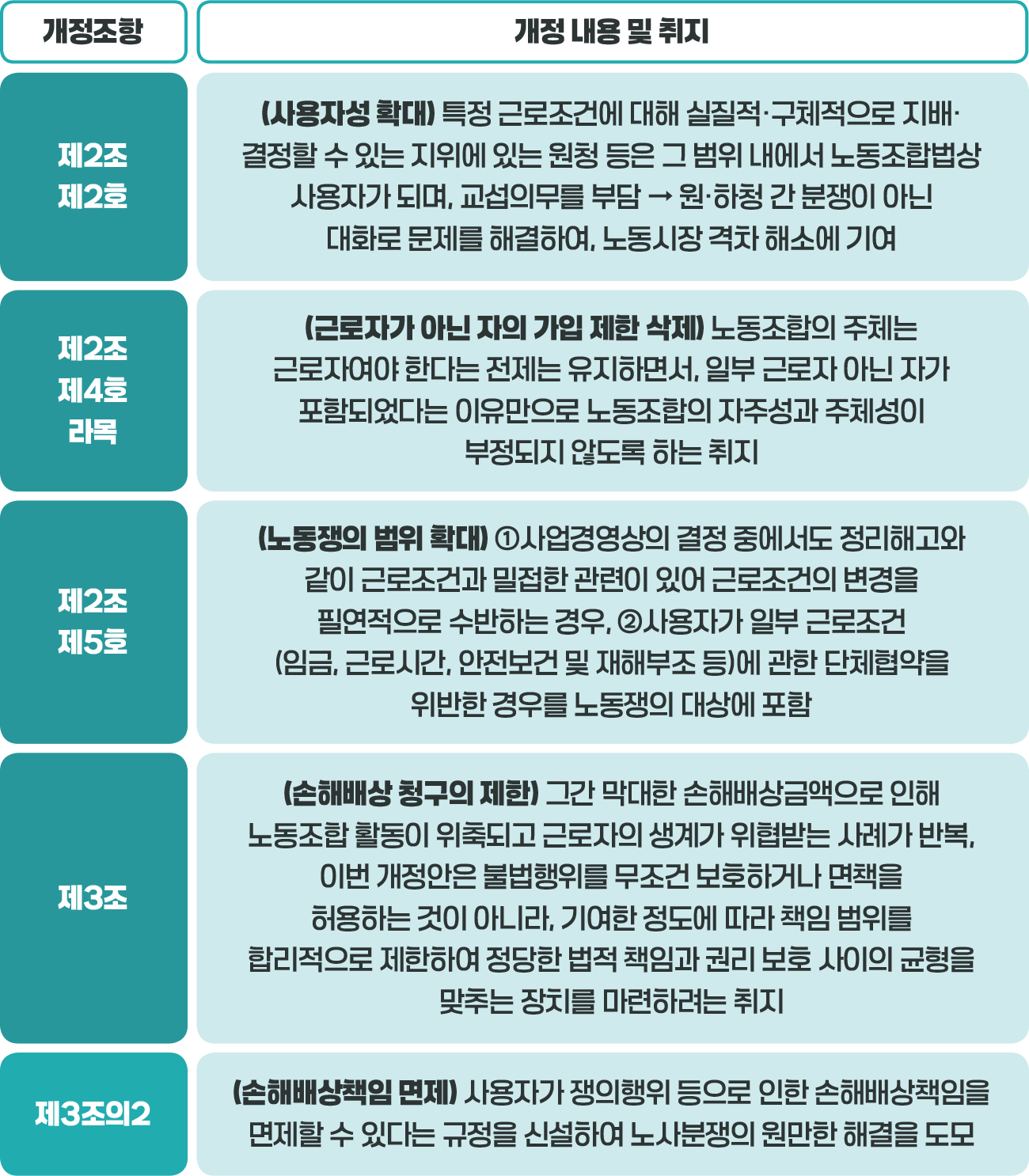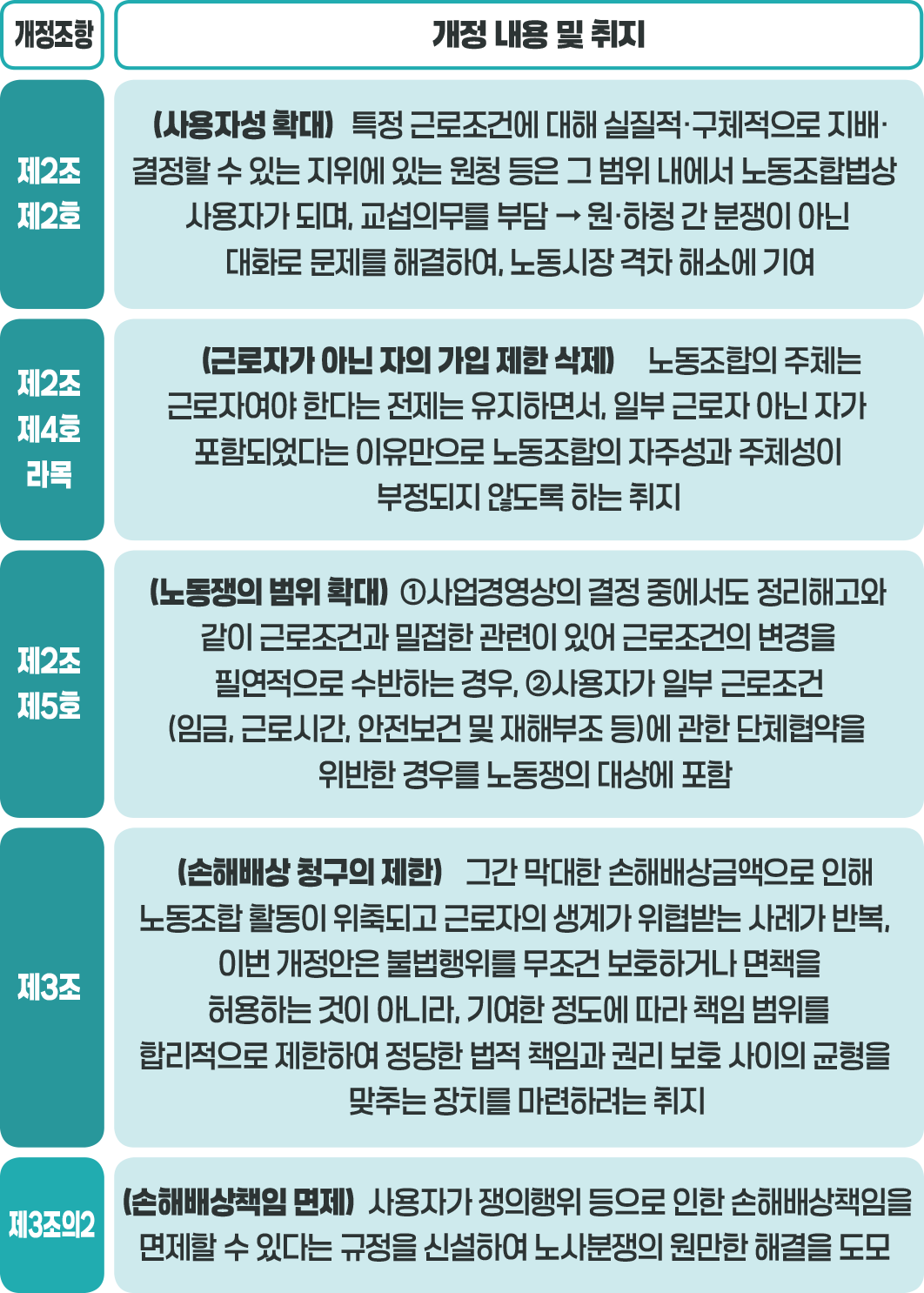 이번 노동조합법 개정은 변화한 노동환경과 산업구조에 대응하여 권한과 책임이 불일치하는 제도적 사각지대를 해소하고, 원·하청 등 다층적 산업구조 하에서의 실질적인 교섭권 보장, 과도한 손해배상 청구로 인한 노동권 위축 문제 등을 해소하는 법적 기반을 마련한 데 그 의의가 있다.