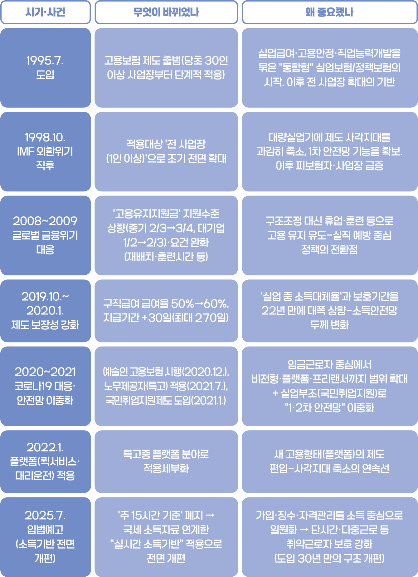 단순한 실업급여 지급 제도로 시작된 고용보험은 지난 30년간 IMF 외환위기, 글로벌 금융위기, 코로나19 팬데믹 등