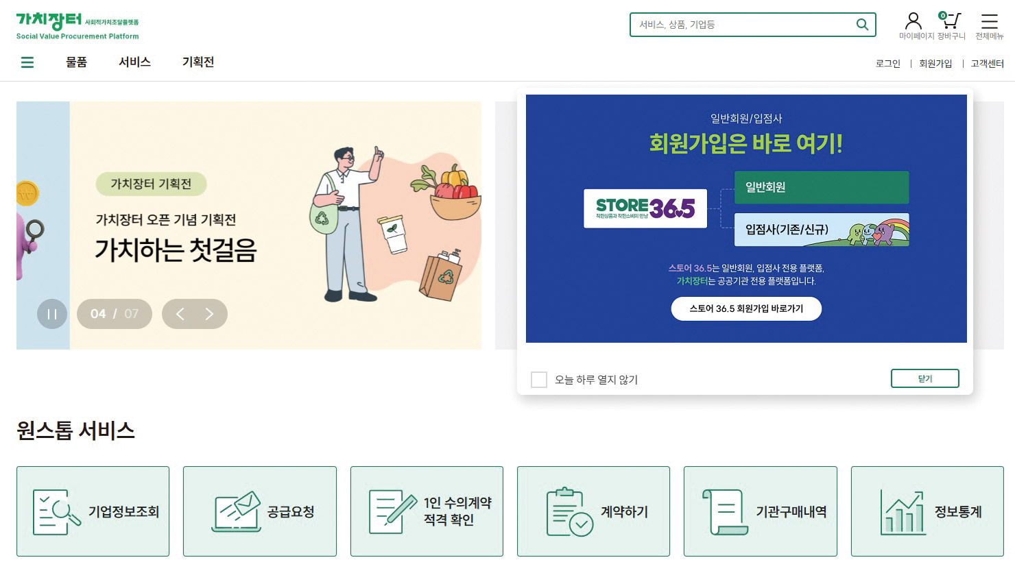 고용노동부와 한국사회적기업진흥원은 9월 8일 사회적가치조달 플랫폼 ‘가치장터’와 착한소비 상품몰 ‘스토어 36.5’를 새롭게 열었다. 기존 ‘이스토어 36.5’를 공공기관 전용 ‘가치장터’와 국민 대상 ‘스토어 36.5’로 분리·확대한 것이다. ‘가치장터’는 공공기관과 사회연대경제기업이 발주부터