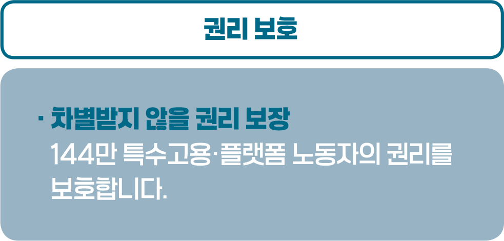 인구구조 변화와 AI·기후위기 등 산업구조 변화에 대응해 노동시장 참여를 촉진하고 노동소외를 방지한다. 중장년은 경력설계와 재취업 지원을 확대하고, 일하는 부모는 10시 출근제와 방학 중 육아휴직으로 지원한다. 100만 외국인 노동자를 소중한 이웃으로 정착시키기 위해 전체 외국인력을 DB화하고, 비전문에서 숙련 인력으로 전환 경로를 마련한다. ‘AI+ 역량 業UP 프로젝트’로 15만 명에게 AI 역량을 강화하고, AI대응 일자리정책 로드맵을 마련한다. 144만 특수고용·플랫폼 노동자를 위해 ‘일하는 사람의 권리에 관한 기본법’을 제정하고 노동자 추정제를 도입한다. 고용보험 적용기준을 소득으로 개편하고, 지역고용활성화 법률 제정으로 지방정부 중심 일자리정책을 강화한다.