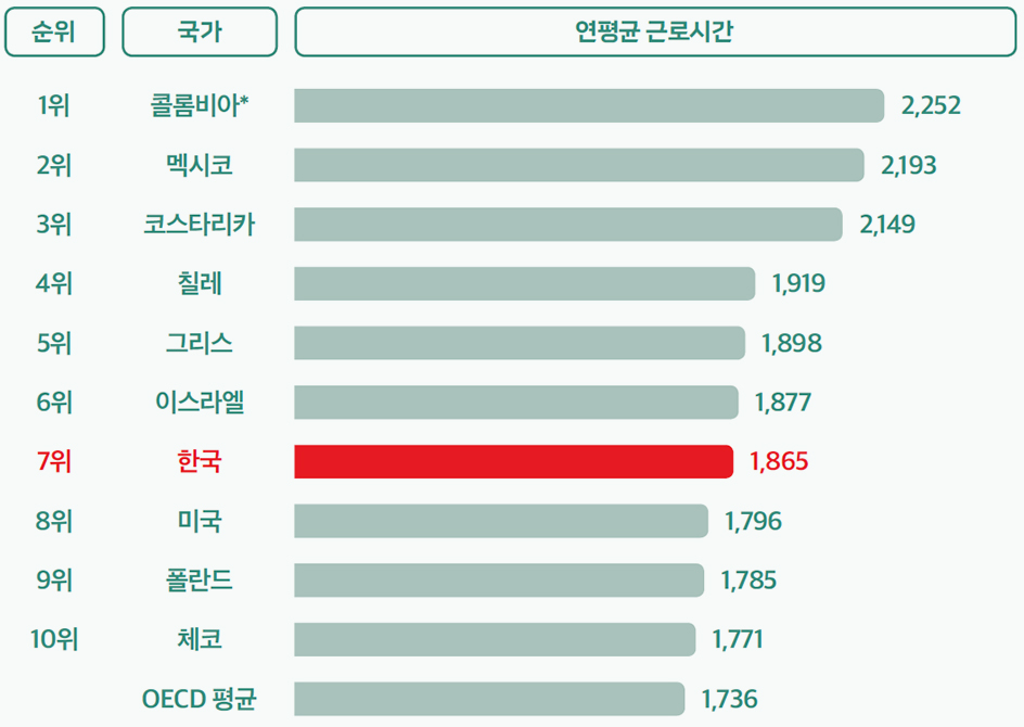 2024년 연평균 근로시간 상위 OECD 국가