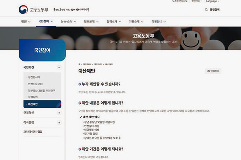 고용노동부는 3월 6일부터 누리집에 ‘국민참여 예산제안 게시판’을 개설하고 2027년도 예산 편성에 국민 의견을 반영한다. 이번 조치는 국민이 고용·노동·산업안전 분야 예산 아이디어를 직접 제안하도록 해 재정 운용의 투명성과 실효성을 높이기 위해 추진됐다. 접수된 제안은 관계 부서 검토를 거쳐 정부 예산안에 반영될 예정이며, 청년·AI·산업안전 등을 주제로 한 간담회도 병행해 현장 수요를 추가 발굴한다. 정부는 국민 참여를 확대해 정책 품질을 높이고 체감도 높은 예산 편성을 추진할 계획이다.