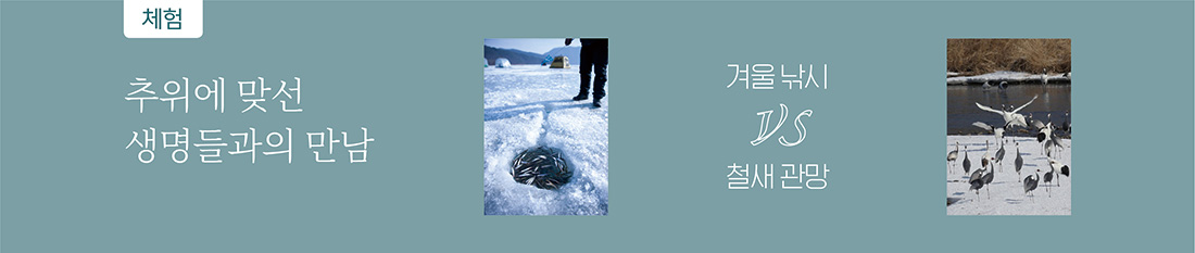 겨울 낚시의 진수를 느껴볼 수 있는 화천 산천어 축제가 오는 1월 4일 개장을 앞두고 있습니다. 매년 100만 명 정도가 방문할 정도로 많은 사랑을 받고 있는 화천 산천어 축제는 겨울 낚시는 물론 눈 조각상, 눈썰매 등 즐길 거리가 가득한데요. 무엇보다 현장에서 낚은 산천어를 즉석에서 튀김이나 횟감으로 먹는 재미가 쏠쏠합니다. 한편, 화천에서 멀지 않은 철원은 철새들이 사랑하는 곳입니다. 땅 속에서 흘러나온 따뜻한 물 덕분에 먹이를 비교적 쉽게 얻을
